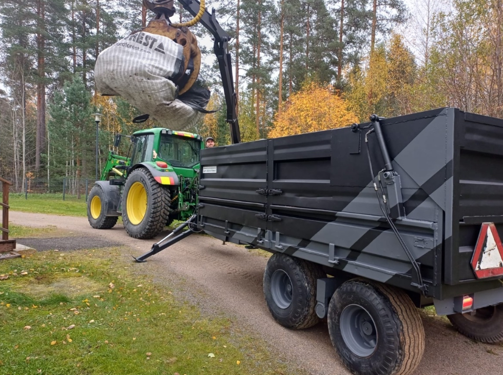 - john deere traktori + peräkärry, johon saa nosturin ja kouran.